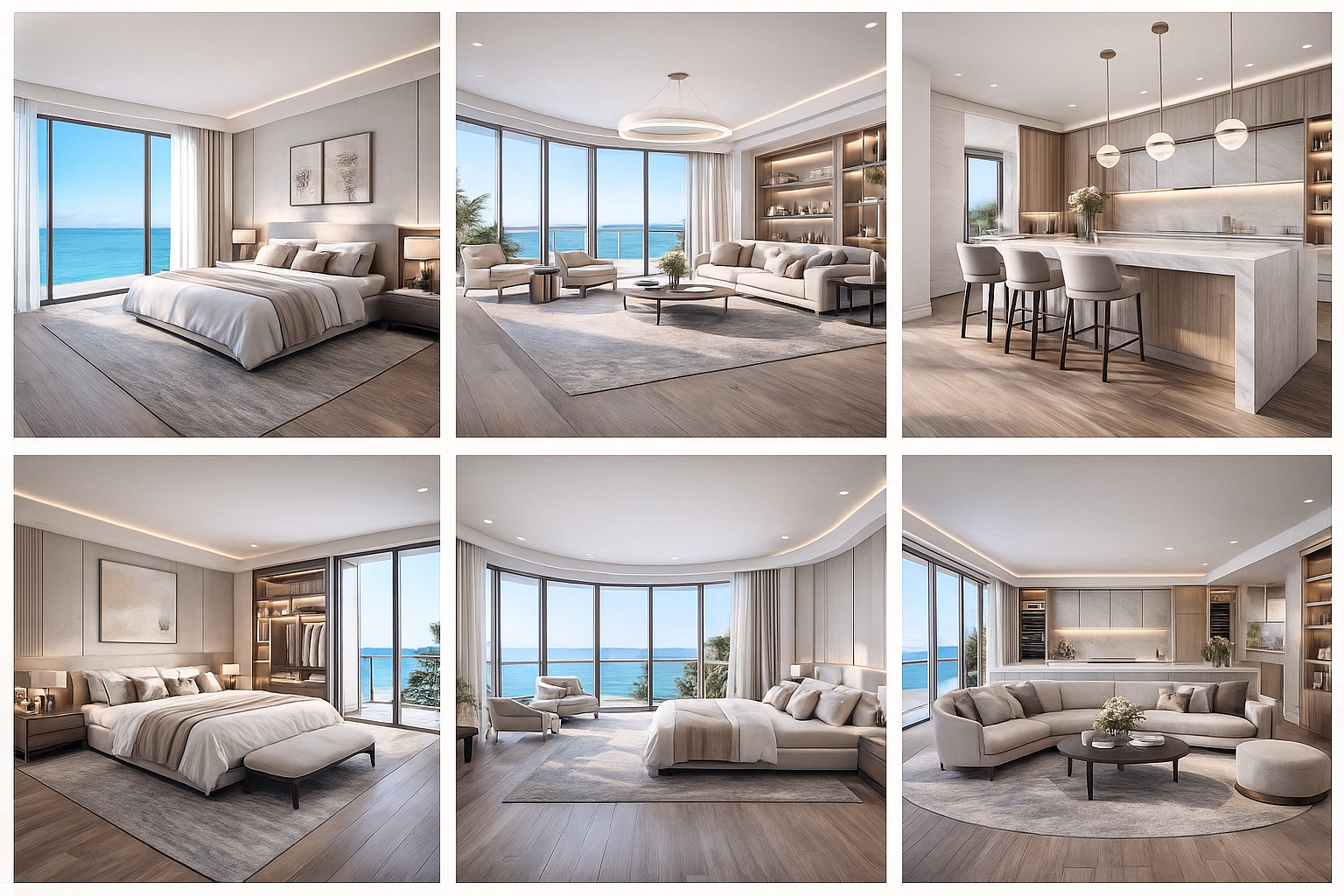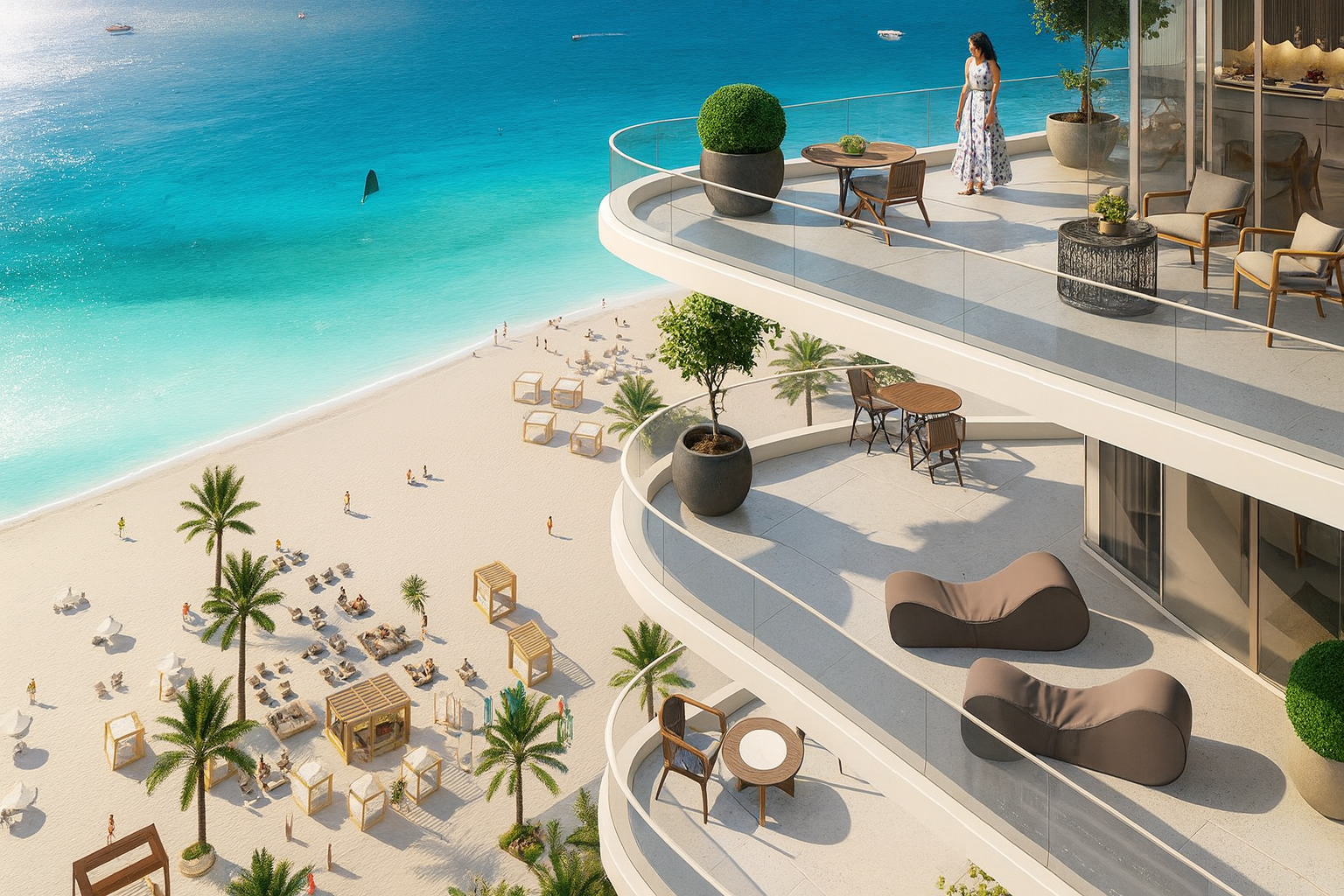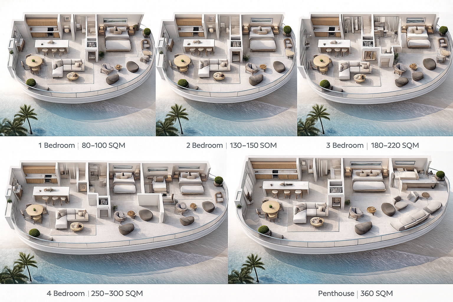 1–4 bedroom beachfront apartments and signature penthouses ranging from 80 sqm to 360 sqm, each featuring expansive curved balconies, open-concept interiors, and panoramic sea views.